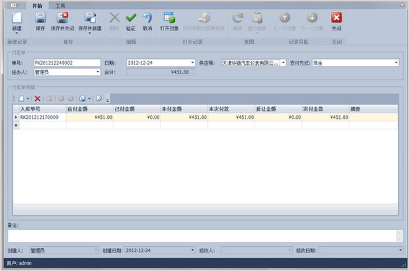 選擇供應(yīng)商,此該用戶所有需要付款的采購入庫單,費用都會自動顯示到付款明細中,如下選擇“天津華獅汽車儀表有限公司 ”付款明細中會自動填充付款的一條記錄,如下圖所示: