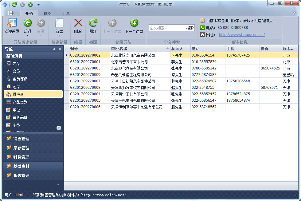 傲藍(lán)汽車(chē)配件銷(xiāo)售管理軟件,里面的供應(yīng)商管理,詳細(xì)記錄了供應(yīng)商信息,包括:詳細(xì)的單位名稱(chēng)、聯(lián)系人、電話、地區(qū)、手機(jī)等,方便查找。還可以利用關(guān)鍵詞在軟件中進(jìn)行搜索查找方便快捷。