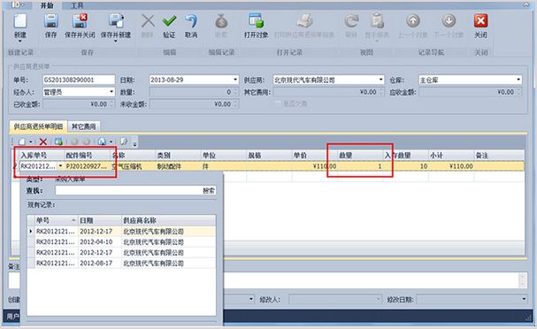 第3步、在供應(yīng)商退貨單明細(xì)中添加退貨明細(xì),即選擇需要退貨的入庫單號、配件編號和輸入退貨的數(shù)量。