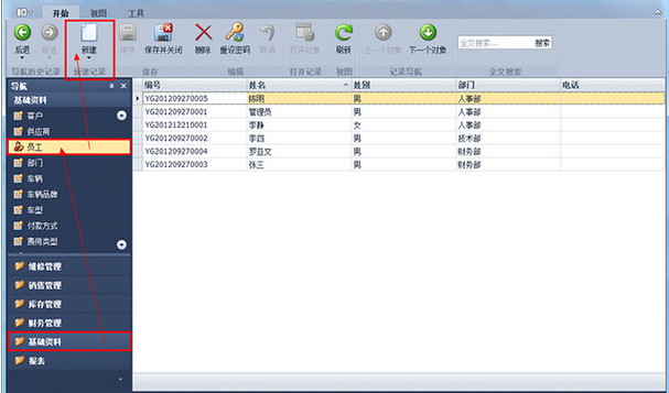 第1步、登錄傲藍(lán)汽車維修管理系統(tǒng),點擊“基礎(chǔ)資料”-“員工”,出現(xiàn)員工列表界面。