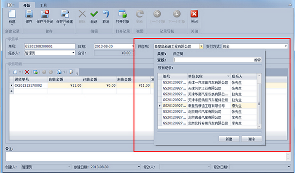 傲藍(lán)汽車維修管理系統(tǒng)-新建供應(yīng)商退貨收款單詳細(xì)界面