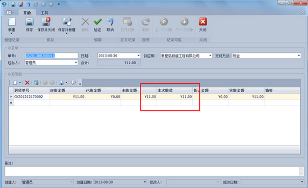 第3步、保存即可完成供應(yīng)商退貨收款單的建立。