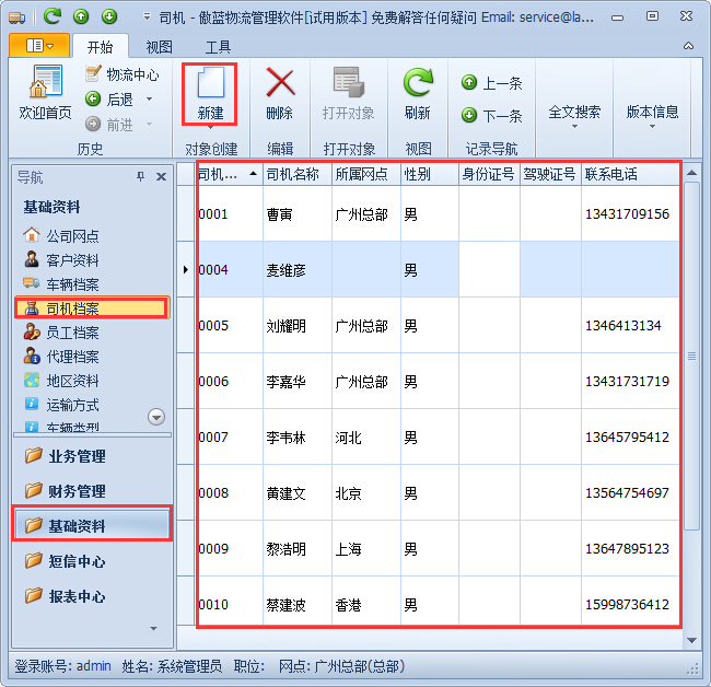 第1步、登錄傲藍物流軟件,點擊“基礎資料”-“司機檔案”,出現(xiàn)司機檔案列表界面。