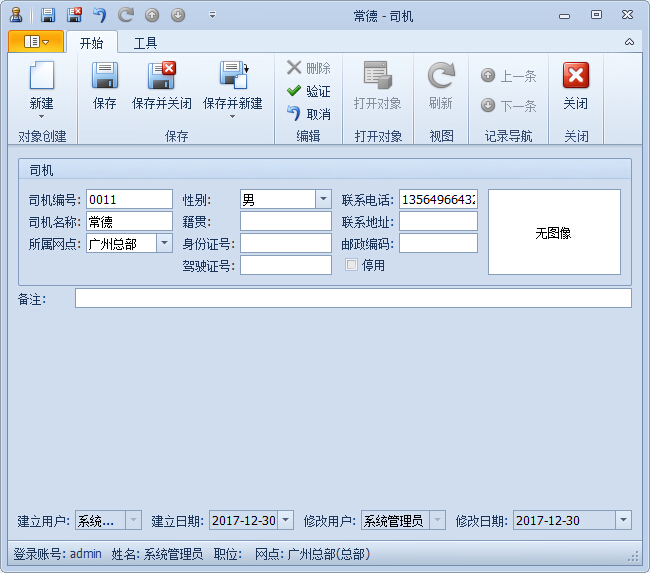 第2步、點擊工具欄的“新建”按鈕,彈出新建司機檔案詳細界面,輸入司機編號、名稱、所屬網(wǎng)點、身份證號、駕駛證號、相片等信息,保存即可完成司機檔案的添加。