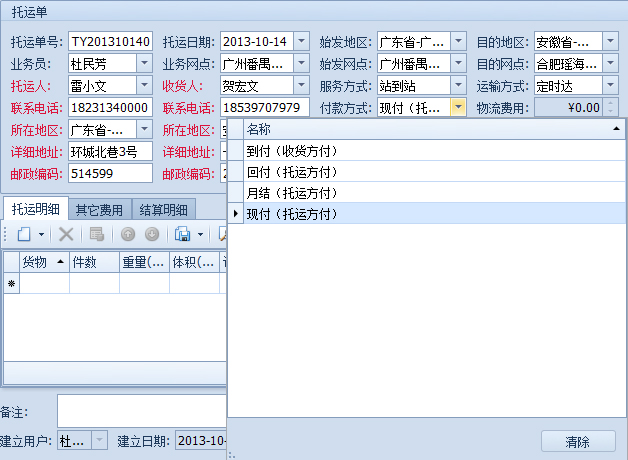 (傲藍物流軟件-新建托運單詳細界面)