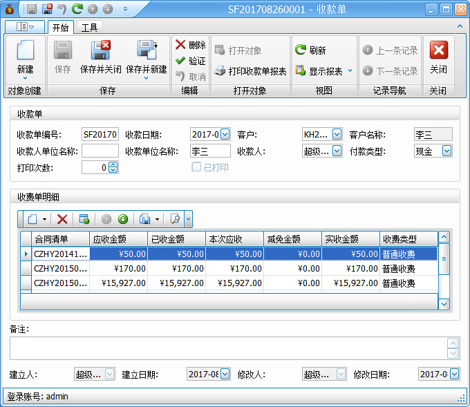 舞臺租賃軟件結(jié)算管理-收款單的具體屬性包括:編號、收款日期、客戶、收款人單位名稱、付款人單位名稱、收款人、付款類型、備注、收費單明細等屬性。