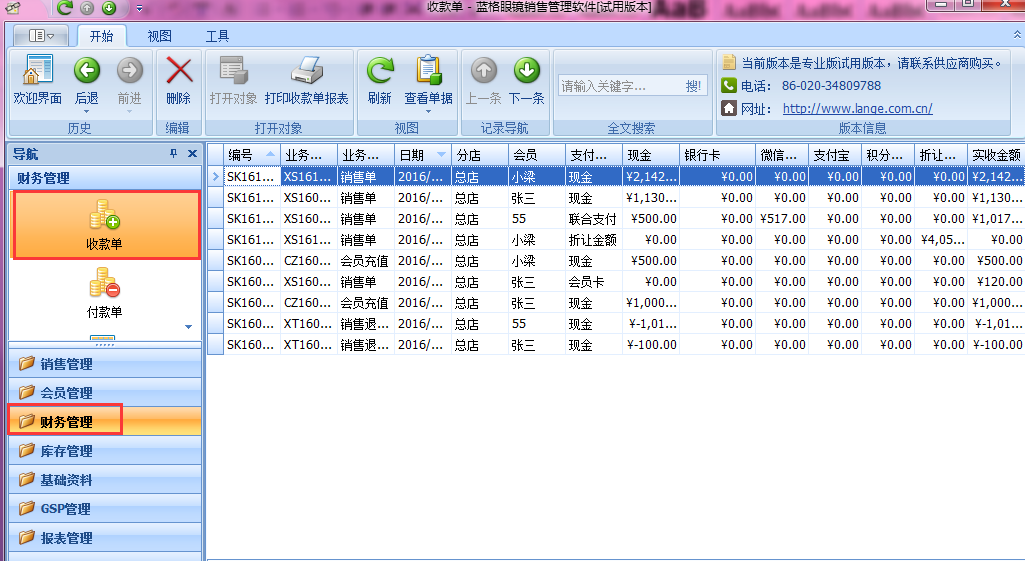 傲藍眼鏡管理軟件有多種的支付方式,如現(xiàn)金,銀行卡,會員卡,微信支付,支付寶支付,積分抵扣,折讓等,在財務管理,收款單里面有清晰的列出每張銷售單的支付方式和金額,方便門店查看各種支付方式的總金額。